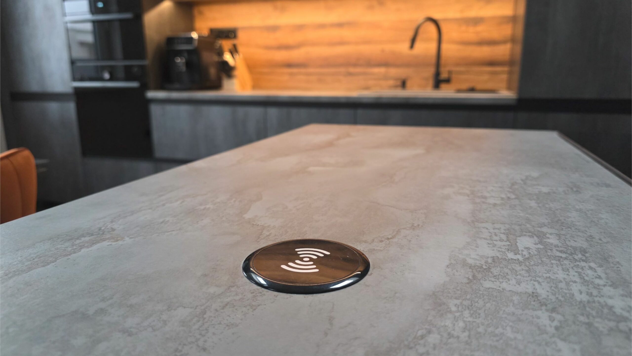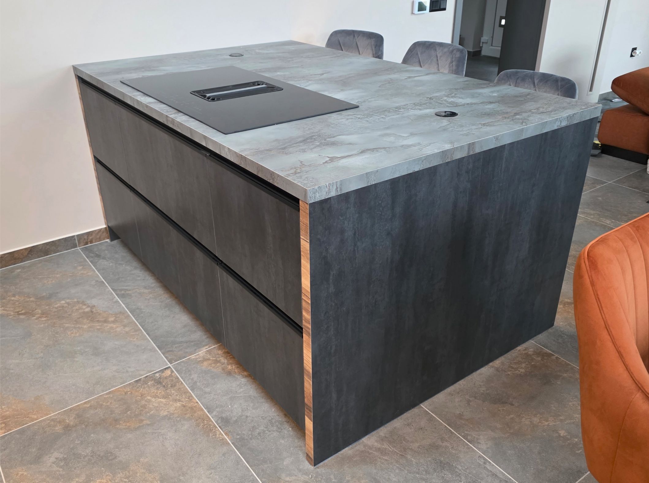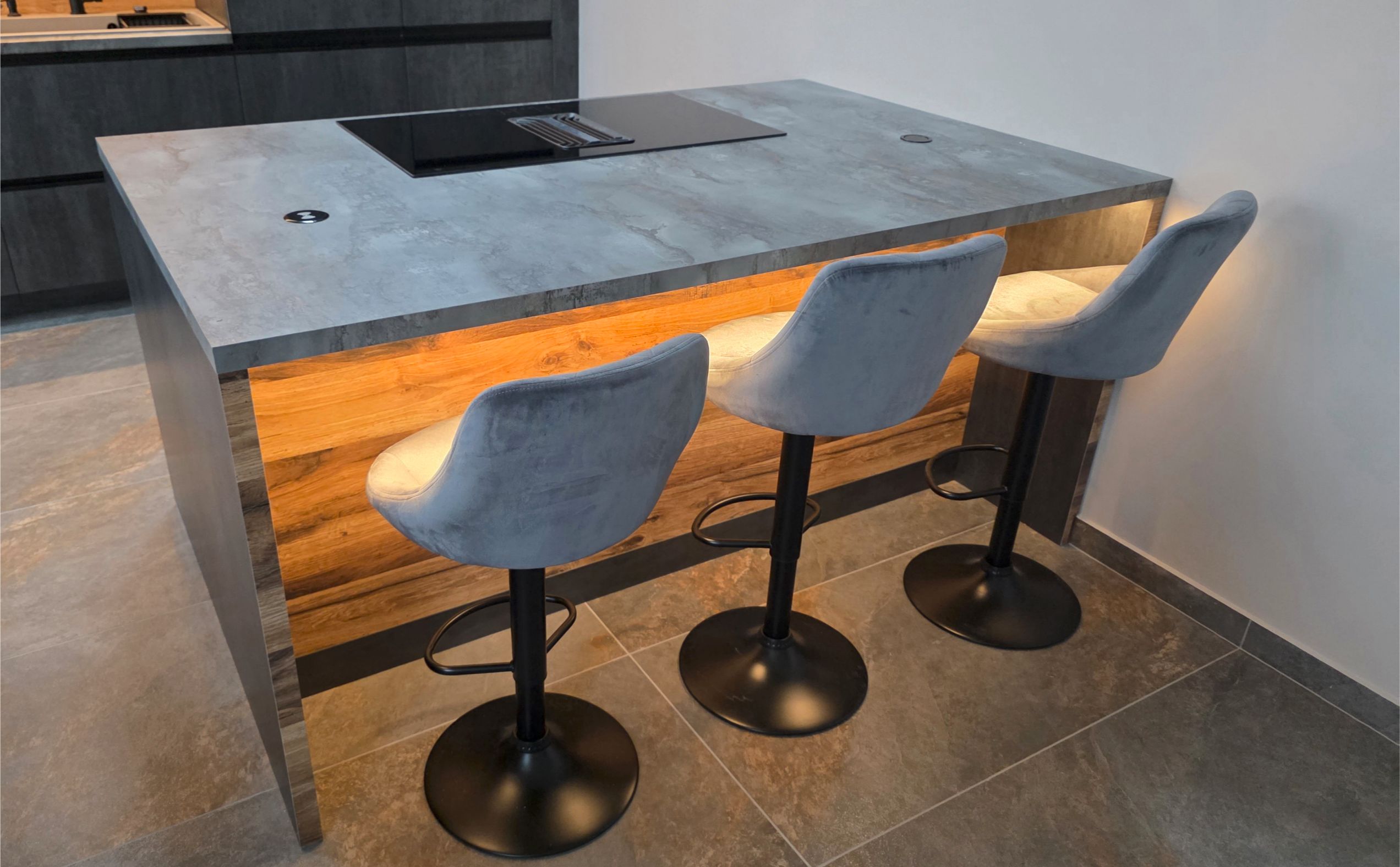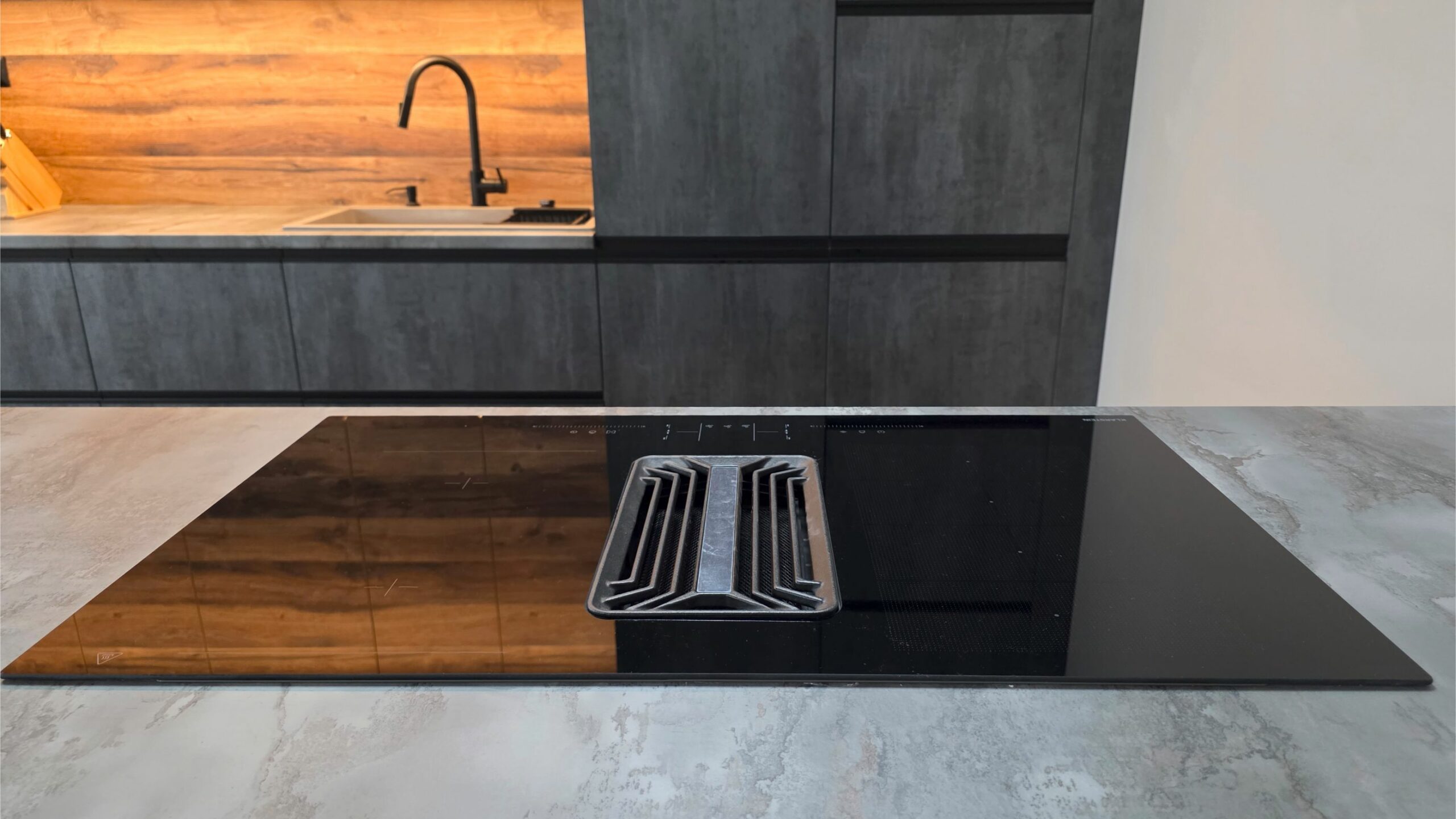 A főzőlap a konyhaszigetbe került beépítésre, az elszívórendszerrel együtt integrált megoldásként. Mivel a konyha közösségi térként is funkcionál, a sziget kialakításánál különösen fontos volt a sokoldalú használhatóság.