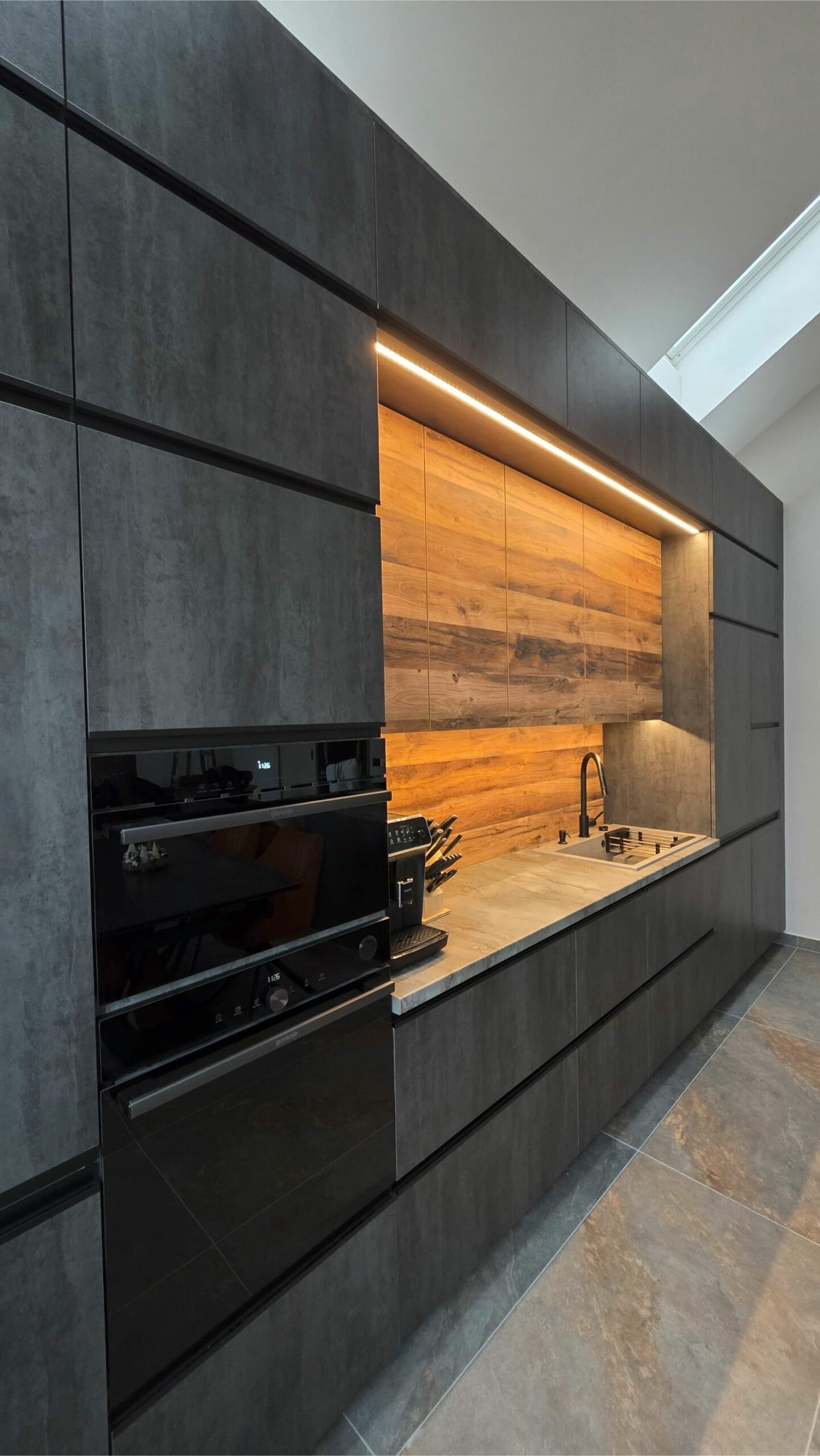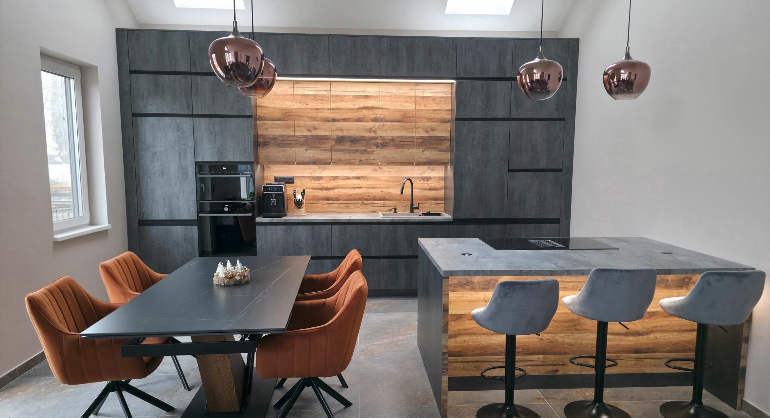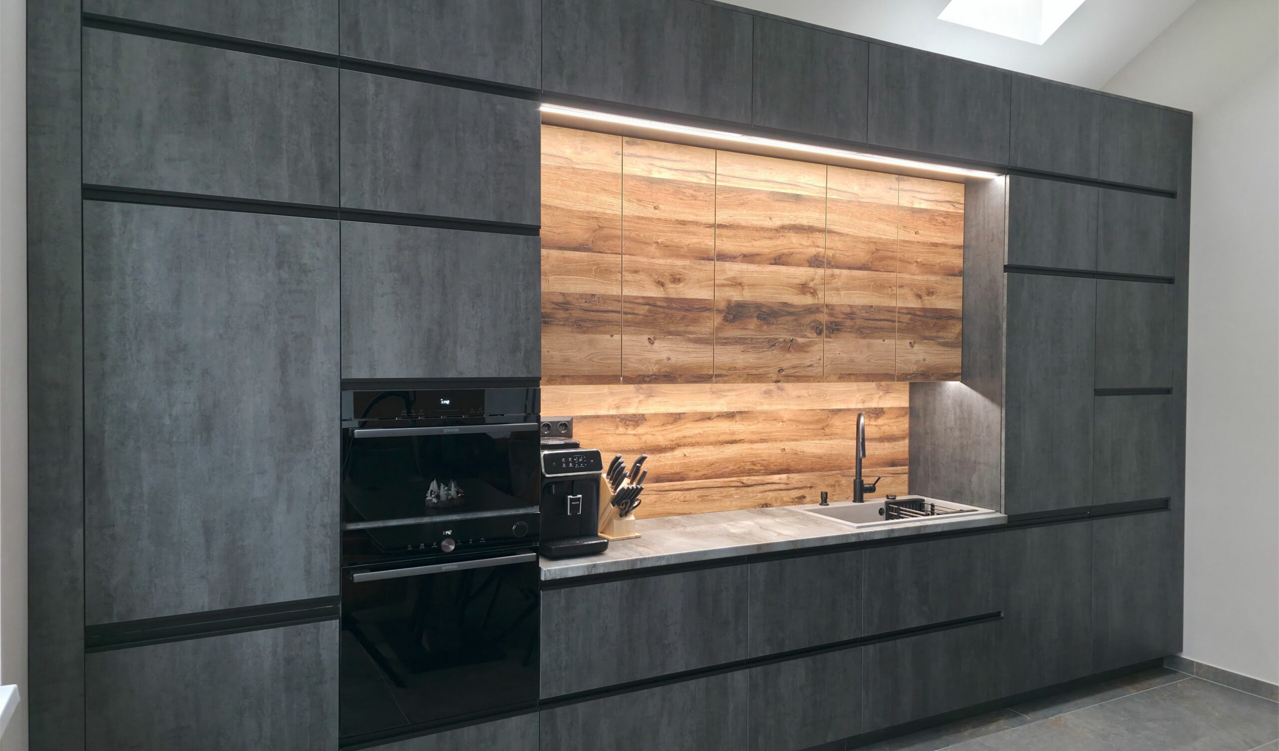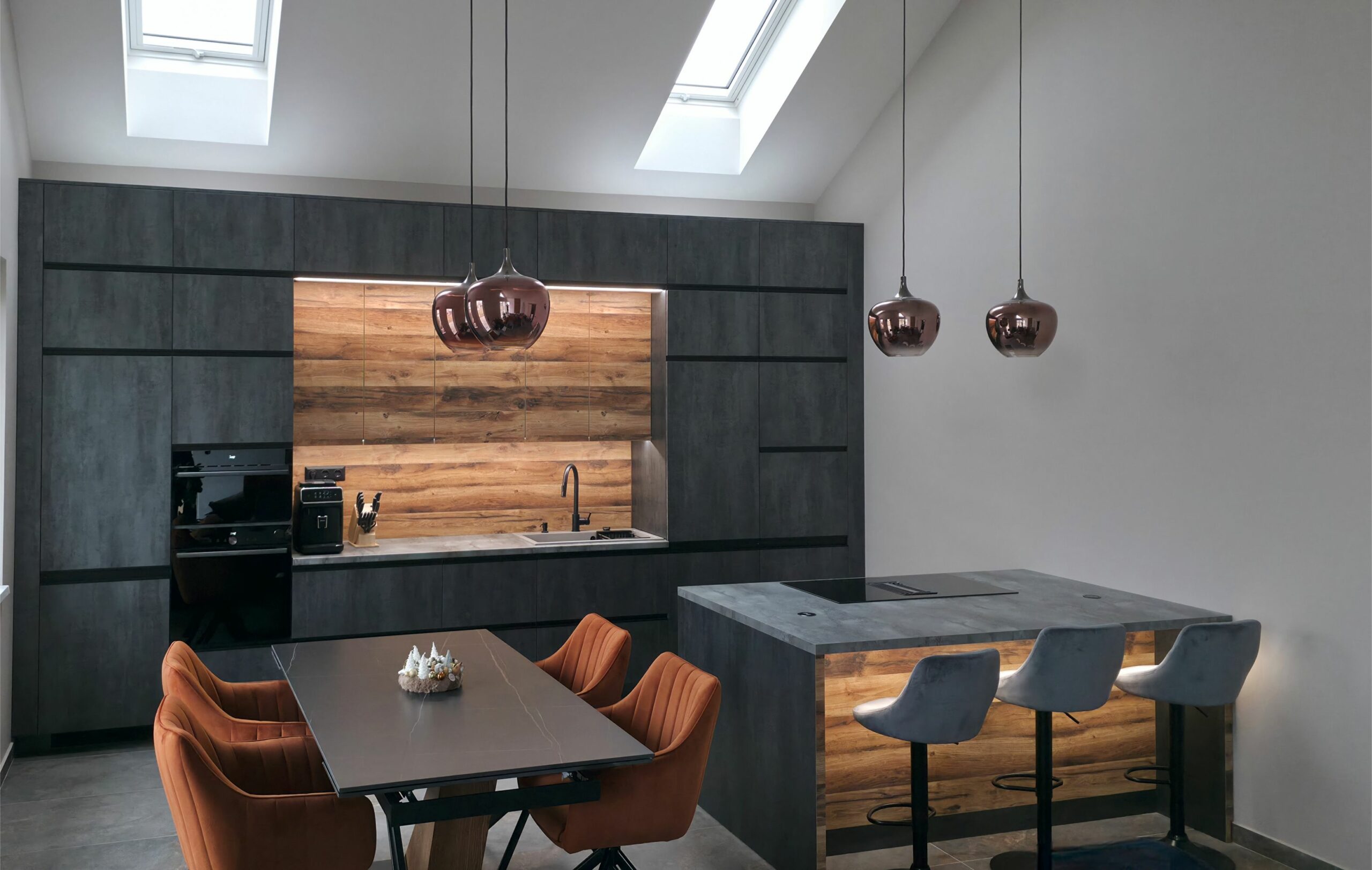 A konyha karakterét a grafit színű frontok és a természetes tölgy felületek harmonikus párosítása határozza meg. Ez az anyagkombináció egyszerre modern és időtálló, miközben melegséget visz a sötétebb tónusokba.