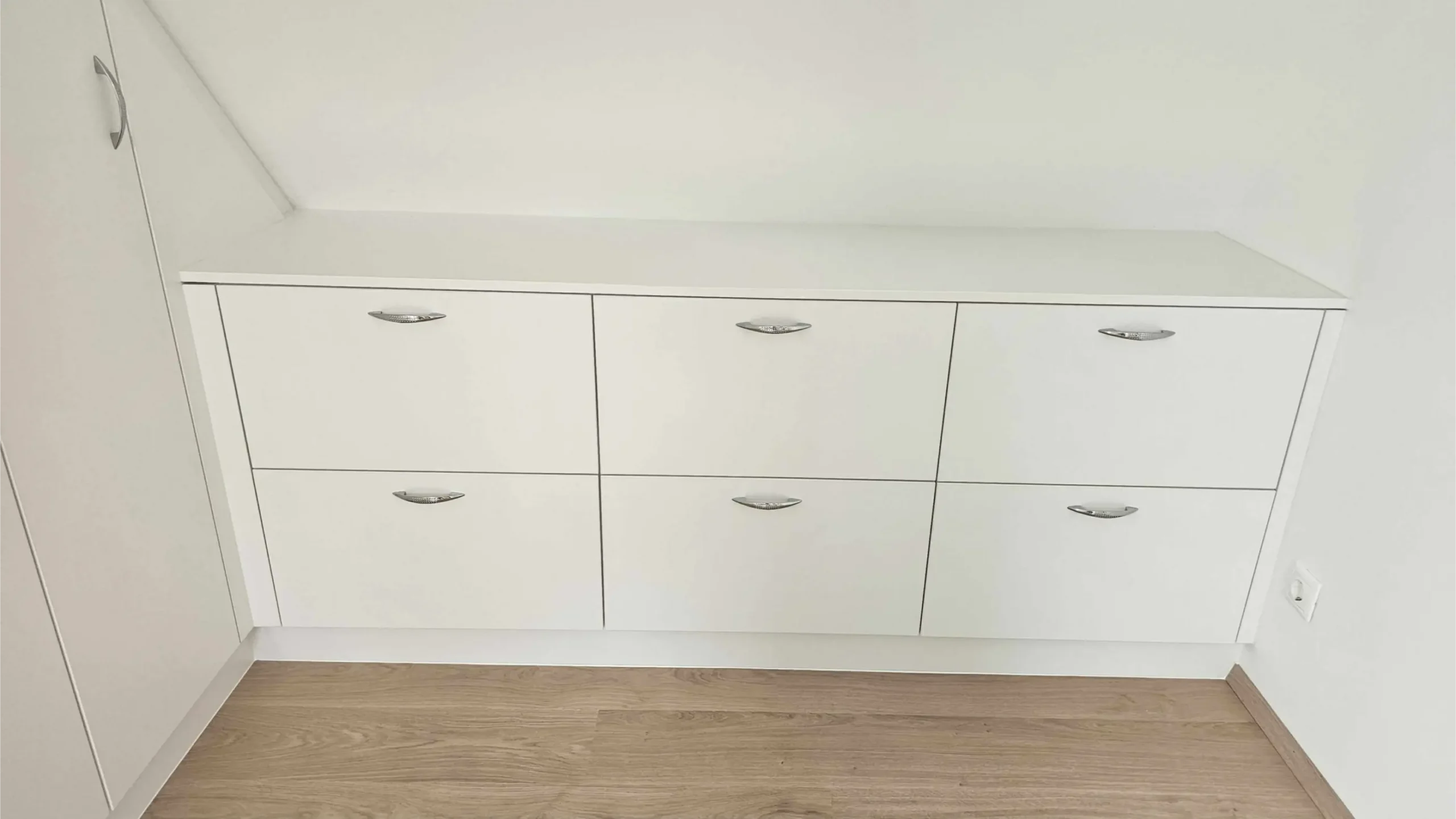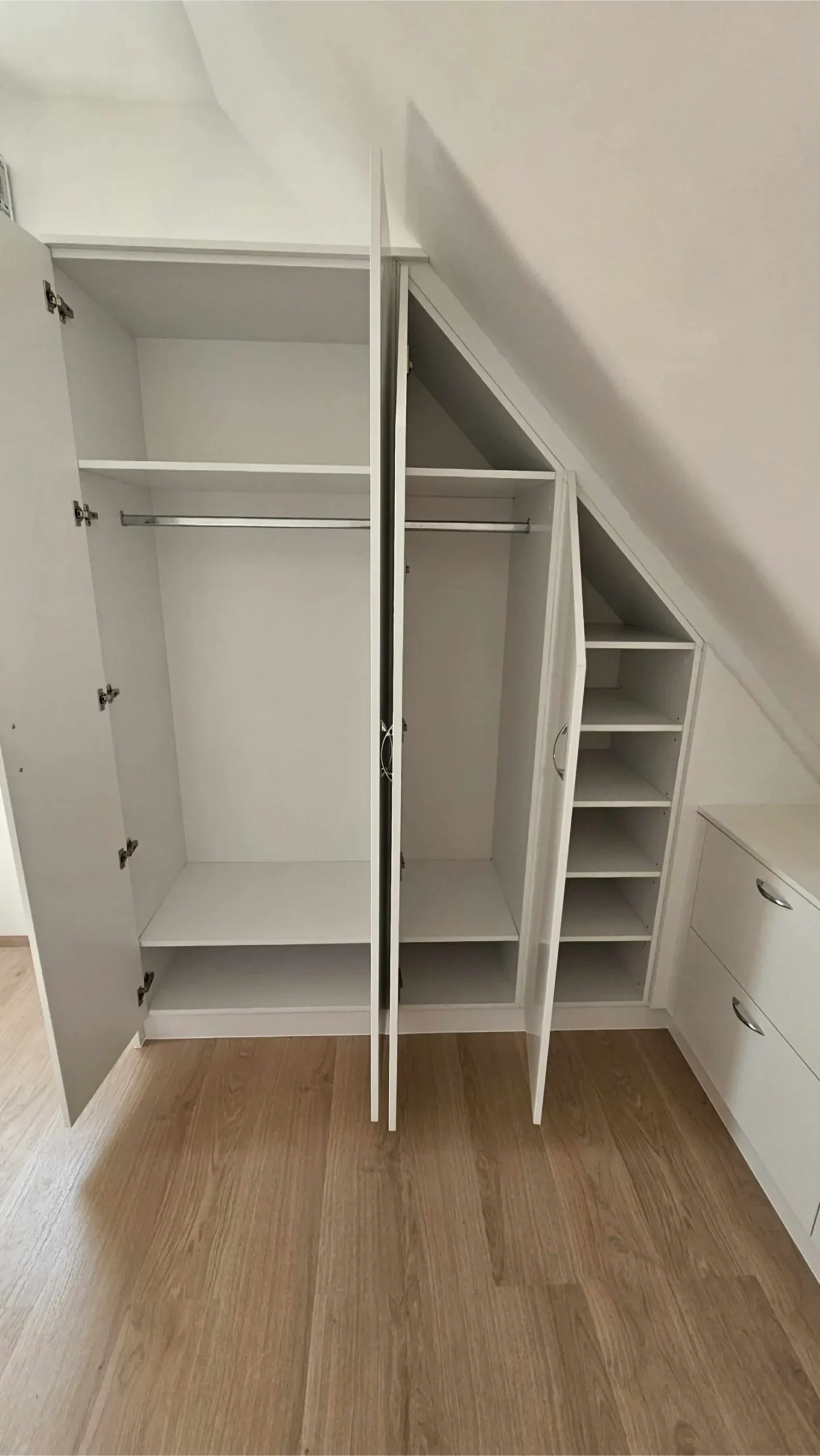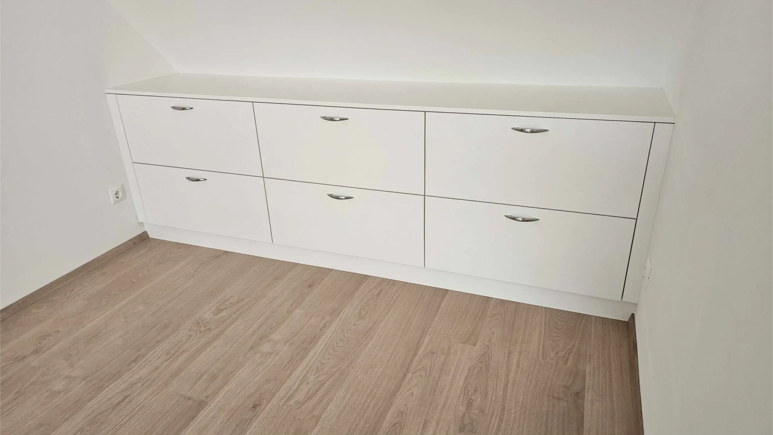 A tetőtér mindig különleges terep: a különböző szögben futó tetősíkok miatt minden bútor egyedi megoldást igényel. Itt nincs két egyforma fal, így a pontosság kulcsfontosságú. Egy apró eltérés is könnyen oda vezethetne, hogy a bútor nem illeszkedik a helyére.